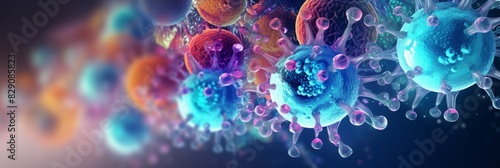 virus banner with red spikes on abstract blue background with copy space. medical laboratory research, Microbiology and virology.