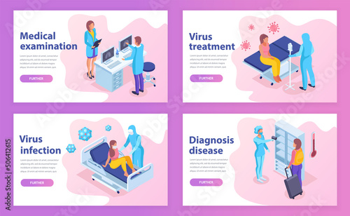 Virus diagnostics in hospital templates for websites etc. Medical workers in protection costumes during an epidemic and patients in a hospital bed. Modern isometric illustration.
