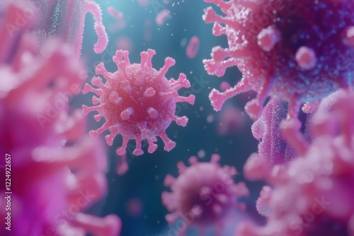 Virus particles in a highly detailed microscopic view showcasing their structure and complexity in a colorful background