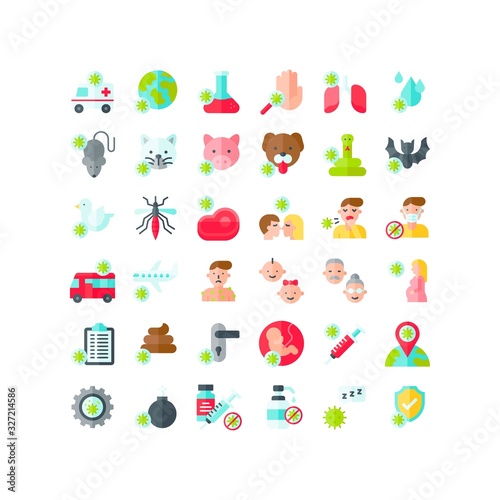 virus transmission or coronavirus related flask, meat, injection, hand wash, water drop, world globe, gear, ambulance, cat, dog, snake, pig, pregnant woman, and lungs vector in flat design,