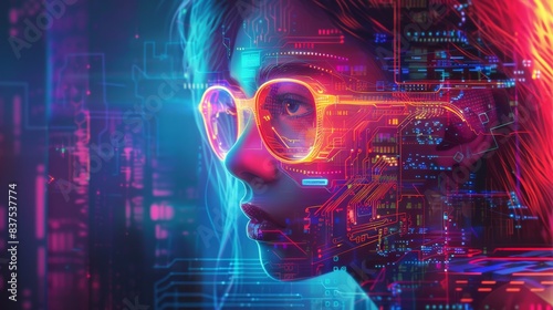 Vision of Innovation: A digital art piece capturing the profile of an AI engineer with futuristic tech elements and circuit patterns on her face, neon and holographic background. advanced technology