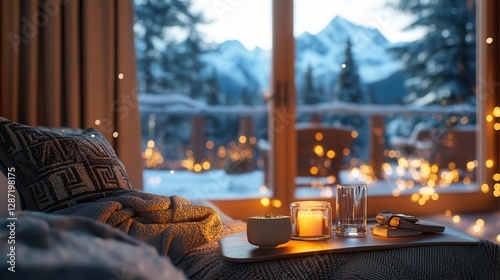 Visiting a ski lodge with glowing AR booking and resort data, cozy winter setting, soft warm lighting, photorealistic