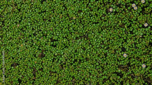 Visual depiction of a pond covered extensively by small floating plants that produce a continuous green layer on calm water.