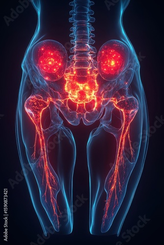 Visual illustration of the female pelvis highlighting joint and nerve structures