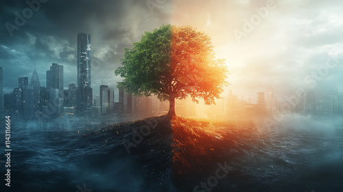 Visual representation of climate change showing contrasting environments with a solitary tree in the center
