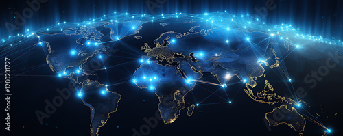 Visual representation of global network connections illuminated by blue light over a dark background