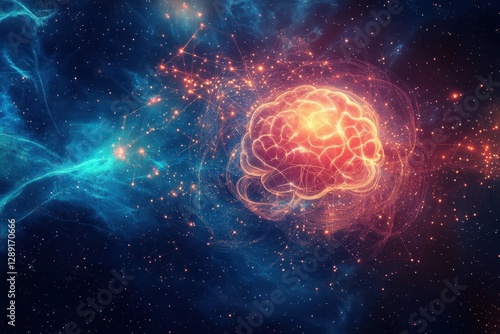 Visualization of a human brain illuminated in a cosmic setting conveying creativity and intelligence