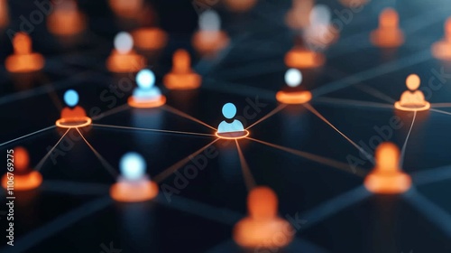 Visualization of interconnected orange and blue nodes forming a communication network, symbolizing teamwork, social structures, and collaborative efforts