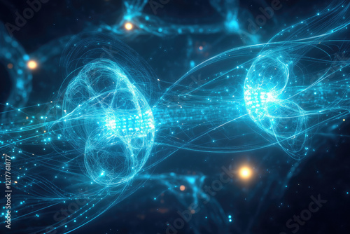 Visualizing entangled particles in deep space with stunning blue light and intricate patterns. Capturing essence of quantum physics intricacies and cosmic relationships