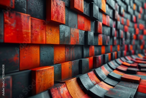 Visually striking image featuring a curved wall of vibrant red and black textured cubes in a repetitive pattern