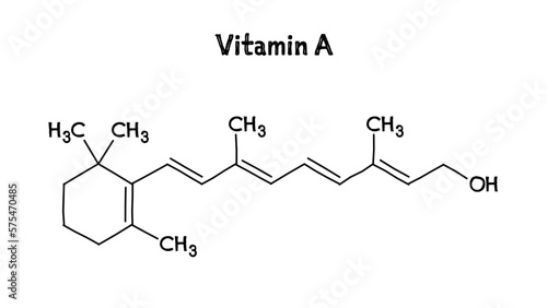 Vitamin A molecular structure. Vitamin A is important for human vision. .Vector structural formula of chemical compound. Black pen Hand-drawn style.
