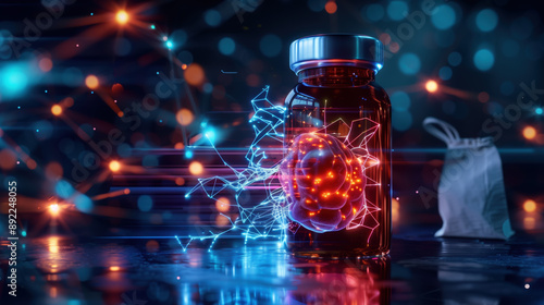 Vitamin B1 for Enhanced Nerve Function, Neurons, Brain Pathways, Hologram, Sleek Glass Bottle, Paper Bag Mock-up