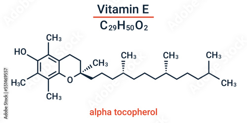 Vitamin E - alpha tocopherol. Vector illustration of a substance chemical formula for medical articles, pill design. Structure of chemical bonds.