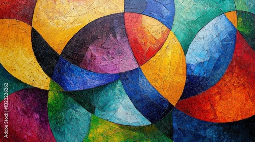 Vivid abstract composition showcases an array of overlapping circular shapes in rich colors like red, blue, yellow, and green, emphasizing bold textures and dynamic visual interest