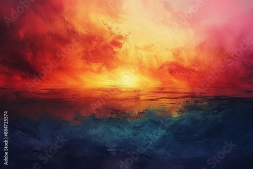 Vivid and dramatic abstract seascape painting of a fiery sunset over the ocean. With red and blue colors. Vibrant sky and water. Warm brush strokes. And a tranquil and serene atmosphere