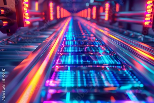 Vivid close-up of a futuristic neon-lit conveyor belt in a cyberpunk setting
