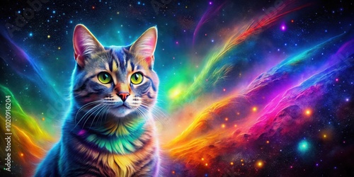 Vivid color cosmic cat with colorful fur and starry patterns, cat, cosmic, colorful, fur, stars, galaxy, space, vibrant, whimsical