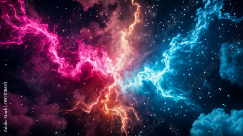 Vivid cosmic lightning converges in a swirling galaxy filled with colorful clouds and sparkling stars
