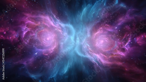 Vivid cosmic nebula with swirling blue and pink energy, forming a symmetrical pattern in deep space, filled with stars and galactic light.