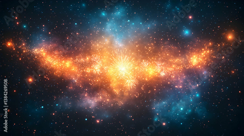 Vivid display of cosmic fireworks with bright orange and blue hues creating a mesmerizing astral event against the dark