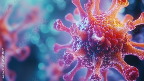 Vivid illustration of HSV virus under a microscope, bright colors and intricate viral structure, medical research concept