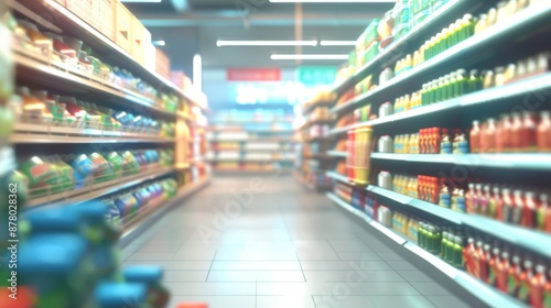 Vivid image featuring fully stocked supermarket and department store shelves, showcasing a variety of products for shoppers