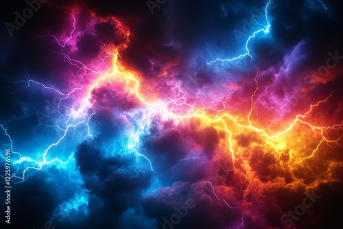 Vivid lightning strikes illuminate dark storm clouds in a dramatic display of nature's power during a thunderstorm