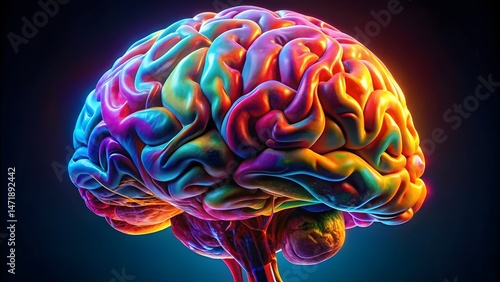 Vivid Multicolored 3D Illustration of Human Brain with Vibrant Hues and Detailed Textures on a Dark Background.
