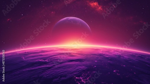 Vivid purple sunrise over planet surface with moon, stars, and nebula in background. Concept of space, galaxy, universe, astronomy.