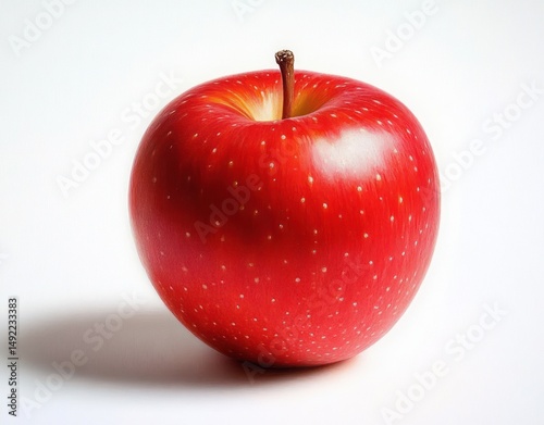 Vivid red apple with small white speckles and a brown stem casting a soft shadow on a white surface, evoking freshness and simplicity