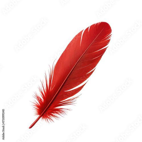 Vivid red feather, isolated on black background. Detailed texture, delicate fringe