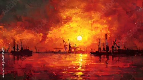 Vivid sunset over a busy harbor, bold oil strokes capturing the silhouette of cranes and ships, intense contrast between sky and water, hand-painted effect