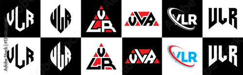 VLR letter logo design in six style. VLR polygon, circle, triangle, hexagon, flat and simple style with black and white color variation letter logo set in one artboard. VLR minimalist and classic logo