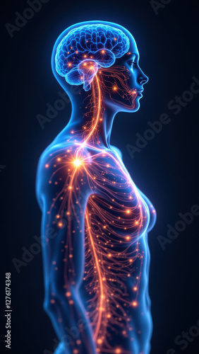 VNS - Vagus Nerve Stimulation. Anatomical model with highlighted nerves showing a potential route for implantation of a VNS device.