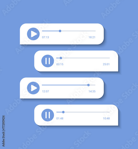 Voice equalizer with spectrum noise and button. Volume audio message. Sound waves with play and pause icons. Social media recording chart. Podcast soundwave line. Vector illustration