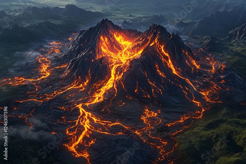 Volcanic eruption displays glowing lava flows on mountains at dawn