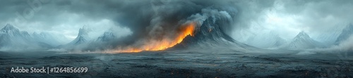 Volcanic Eruption in a Rugged Mountain Landscape with Lava and Smoke. Generative AI