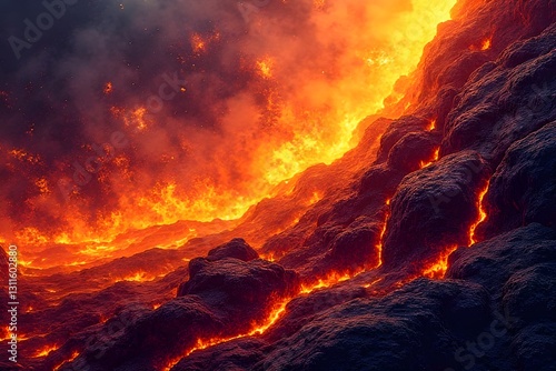 Volcanic Eruption: Molten Lava Flowing Down Mountainside