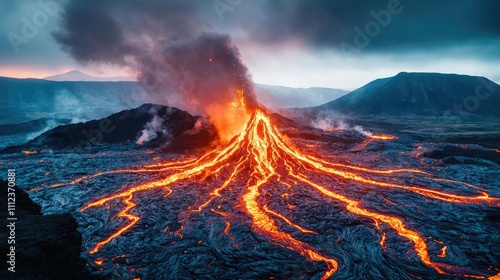 Volcanic eruption with flowing lava, dramatic sky, and rugged landscape.