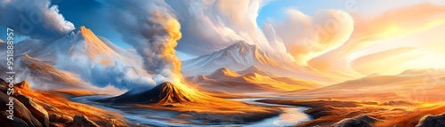 Volcanic Mountain Range with Erupting Volcano.