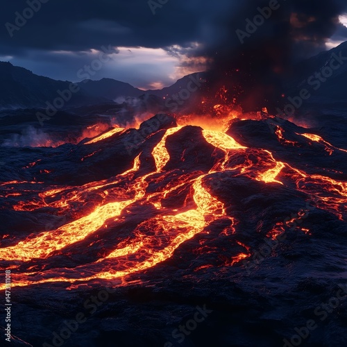 Volcano Eruption with Fiery Lava and Molten Rock in a Dramatic Sky: Capturing Geothermal Activity and Volcanic Landscapes in Earth Science Exploration
