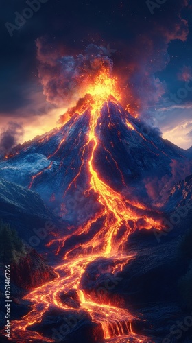 Volcano Eruption With Flowing Lava At Dusk Surrounded By Smoky Sky And Glowing Lava Flowing Downside The Mountainside At Sunset With Fiery Colors in the Sky and Lava Streams