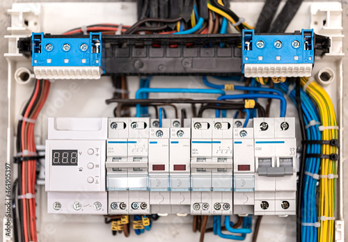 Voltage switchboard with circuit breakers, close up.