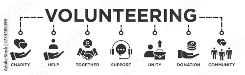 Volunteering banner web icon vector illustration concept for volunteer aid assistant with icon of charity, help, together, support, unity, donation, and community