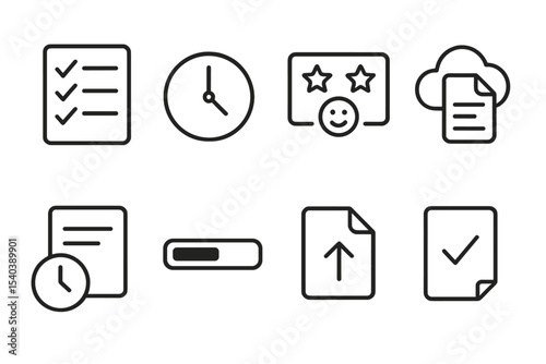 Volunteering Tools Icons. Line style icons of volunteering tools: checklist, clock icon, feedback card, cloud document. time log,