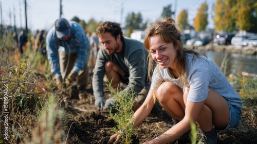 Volunteers Planting Saplings by the River on a Sunny Day, Demonstrating Community Involvement and Environmental Stewardship for a Sustainable Future : Generative AI