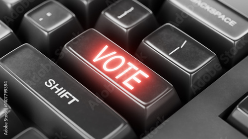Voting text written on a keyboard button. Voting concepts. Black keyboard key with the red word "VOTE" symbolizing the importance of voting in elections and digital participation 3D render.