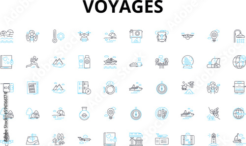 Voyages linear icons set. Adventure, Exploration, Discover, Escape, Journey, Odyssey, Expedition vector symbols and line concept signs. Safari,Trek,Navigation illustration