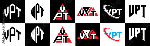 VPT letter logo design in six style. VPT polygon, circle, triangle, hexagon, flat and simple style with black and white color variation letter logo set in one artboard. VPT minimalist and classic logo