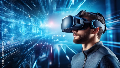 VR Gaming Experience Focus on a person immersed in a VR game, with a dynamic and futuristic background